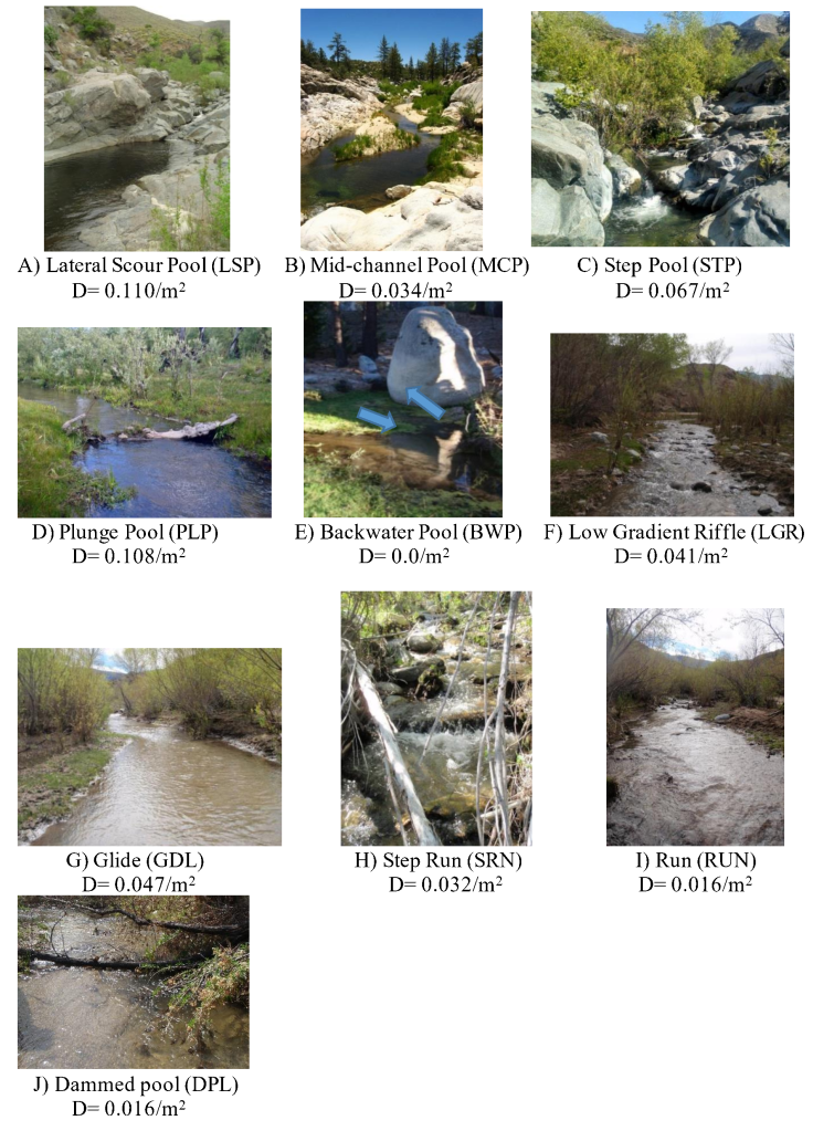 The habitat units as lateral scour pools, step pools, or plug pools, which are known to be used as temporary thermal refuges by rainbow trout during the day in summer (Baltz et al. 1991; Roberts et al. 2013; Nusslé et al. 2015; Meza-Matty et al. 2021) because they are deeper and more thermally stable than the other habitat units in the streams. Thus, the high dissolved oxygen levels enable their resident individuals to maintain a lower level of metabolic expenditure (Jonsson et al. 1991).