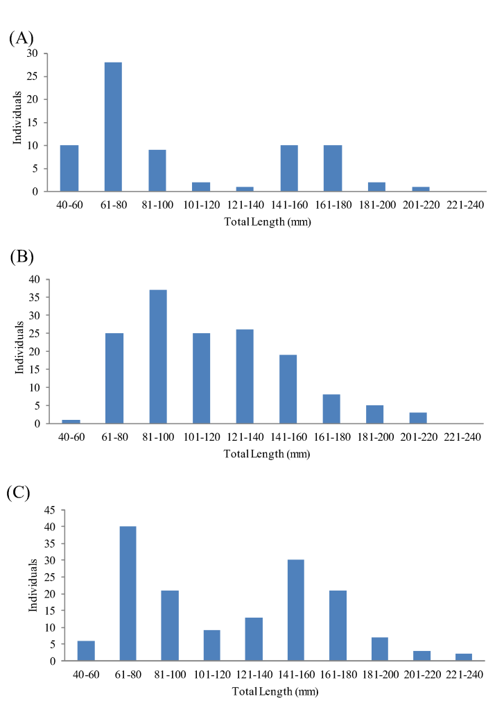 Length of individuals among sampling sites and habitat units.—The mean total length of individuals in three stream sites during the study period was 102.31 ± 46.40 mm in San Antonio de Murillo Creek, 116.47 ± 36.14 mm in San Rafael Creek, and 120.08 ± 45.79 in La Grulla Creek (Fig. 4). The comparison of the total length of individuals among these stream sites (all the sampling events and types of habitat units combined), revealed significant differences (H = 13.1, n = 374, P = 0.002), with the highest median for La Grulla Creek. Furthermore, considering all the streams sampled and sampling events, the total length of individuals among types of habitat unit was different (H = 13.7, n = 357, P = 0.0335), with the highest medians for MCP, SRN and LGR.